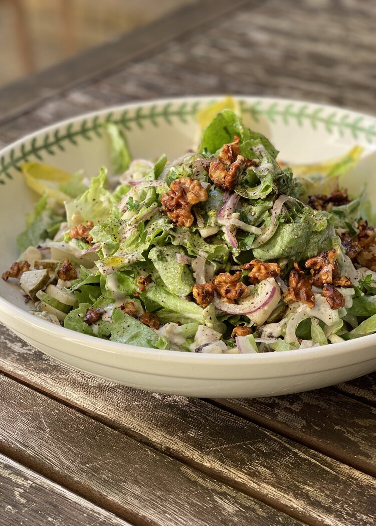 Trust us on this one! We’ve subbed in a zingy and punchy stilton & kefir dressing in lieu of the traditional creamy (/slimy!) mayo-based one. And we’ve stuck to seasonal principles using winter-y pears, celery and red onion, as well raisins or sultanas from the baking cupboard in place of grapes; these add a delicious, concentrated sweetness which contrasts the bitter winter leaves very nicely. Even if you’re a sultana-in-savoury-things skeptic we urge you to give these a go! Chopped parsley adds a fresh herbaceous note, and crispy, fiery honey & chilli roasted walnuts add a delightful crunch, and a quirky pop of heat too.